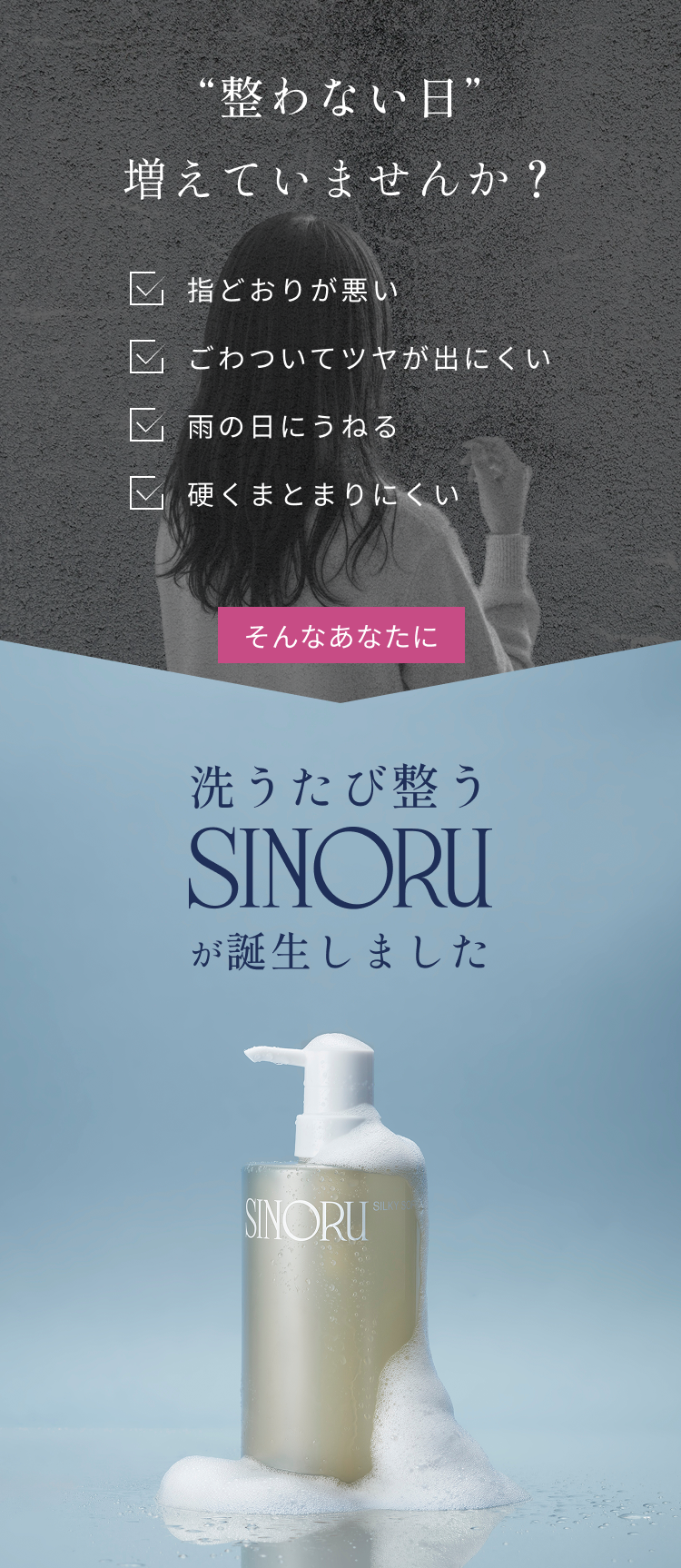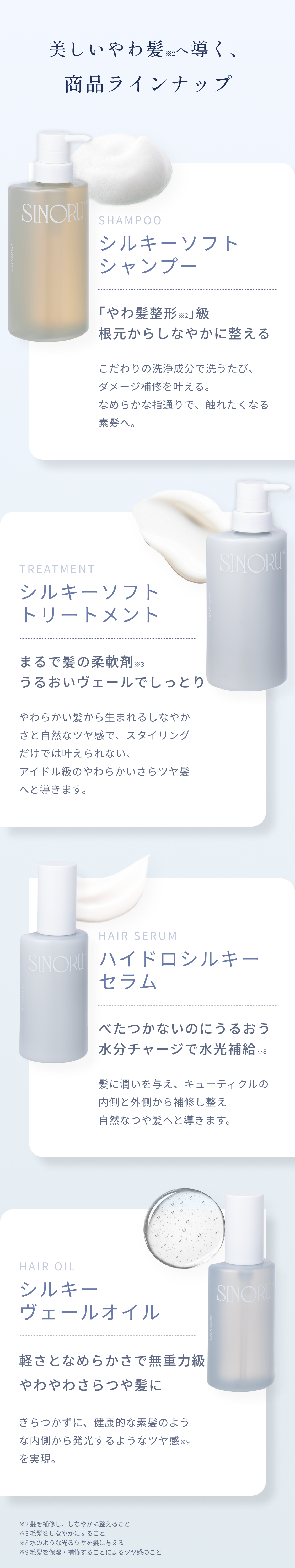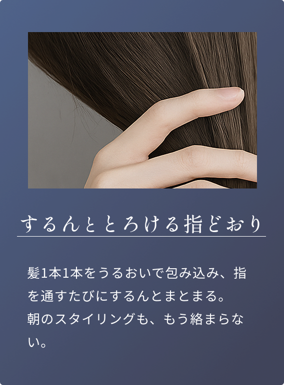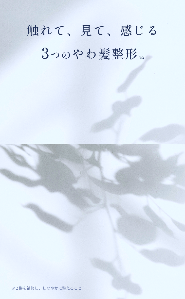 洗浄成分や保湿成分にこだわって処方されており、やわらかくまとまりやすい髪へ導きます。指通りの良さを実感いただけるよう設計しています。使うたびに髪を補修し整え、しなやかな指通りへ導きます。