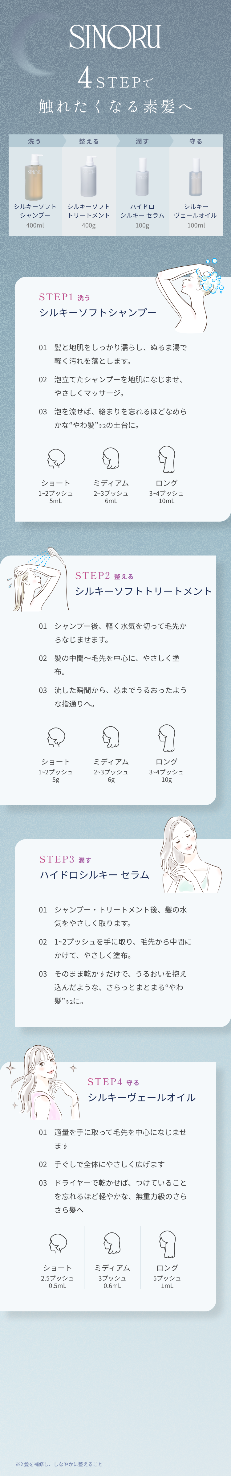 軽やかな質感と髪なじみの良さを両立するように設計しています。髪の量や長さに応じて適量をご使用ください。