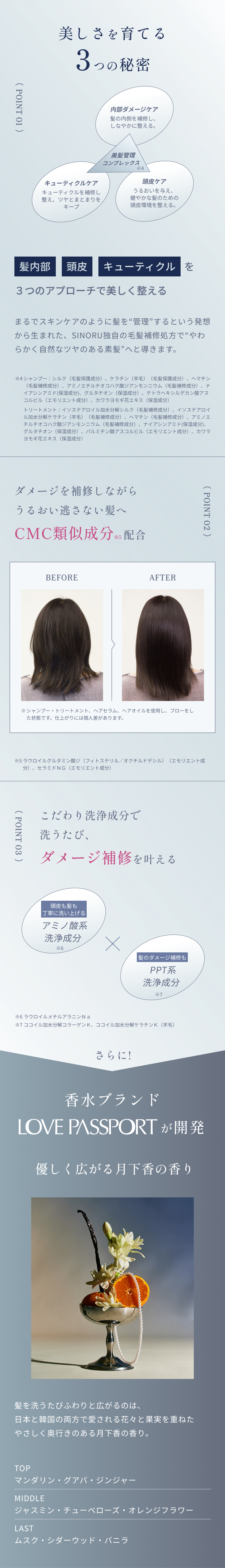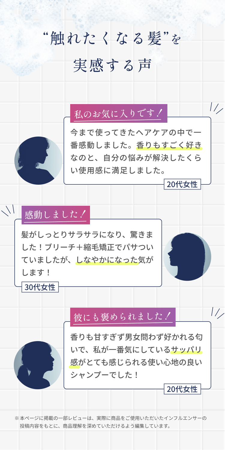 ご使用後もふんわりとした香りが続きやすく、香水のように印象的な香り立ちを目指しています。香りの感じ方には個人差がありますが、翌朝も洗髪後の余韻をお楽しみいただけます。