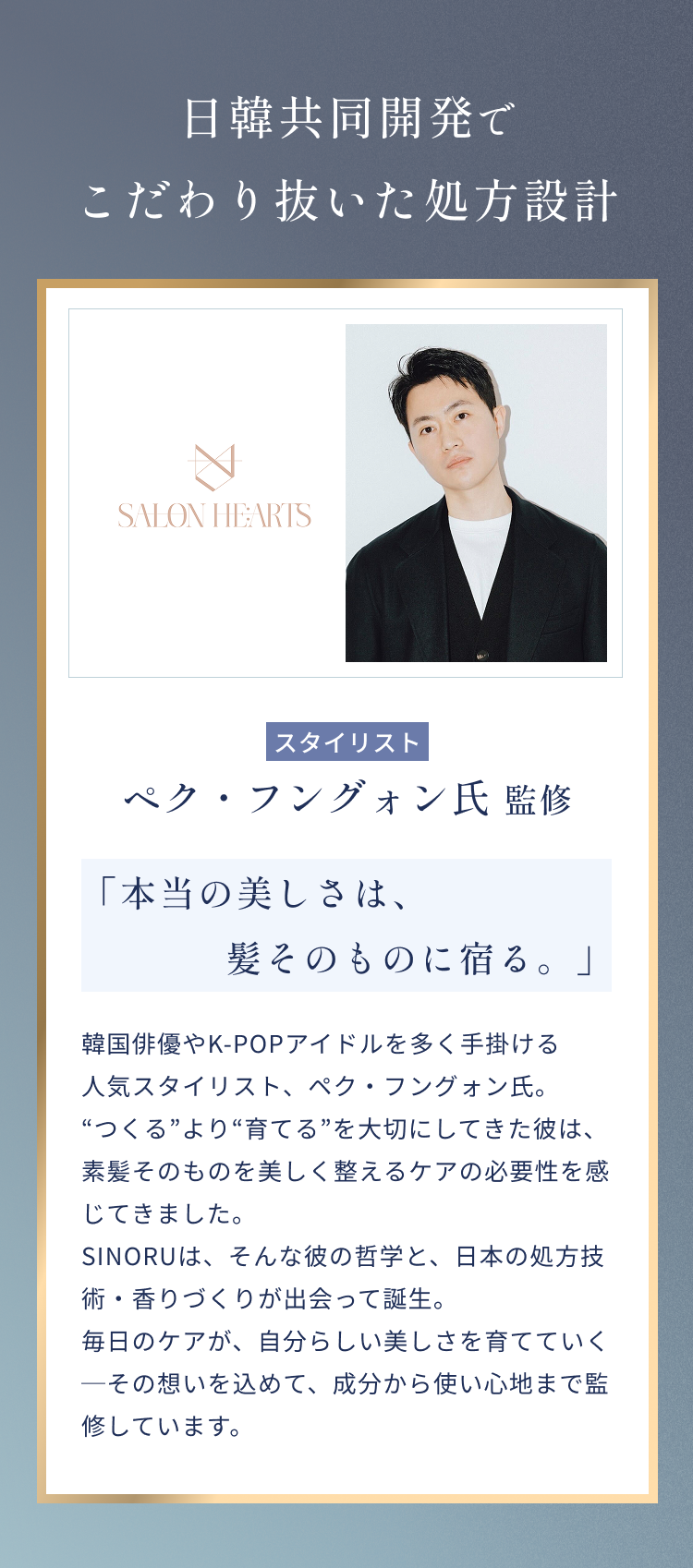 韓国のビューティートレンドと日本の処方開発力を融合したブランドです。日本と韓国の両方で何度も試作チェックを行って開発した商品です。特に日本と韓国の水質の違い(軟水と硬水)も乗り越え両国で満足できる仕上がりと香り立ちにしております。