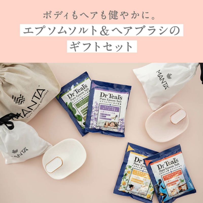 お風呂の中でシャンプーやマッサージにも使えるマンタ ヘアブラシとティールズ エプソムソルト4種類(各1回分)の豪華ギフトセット。