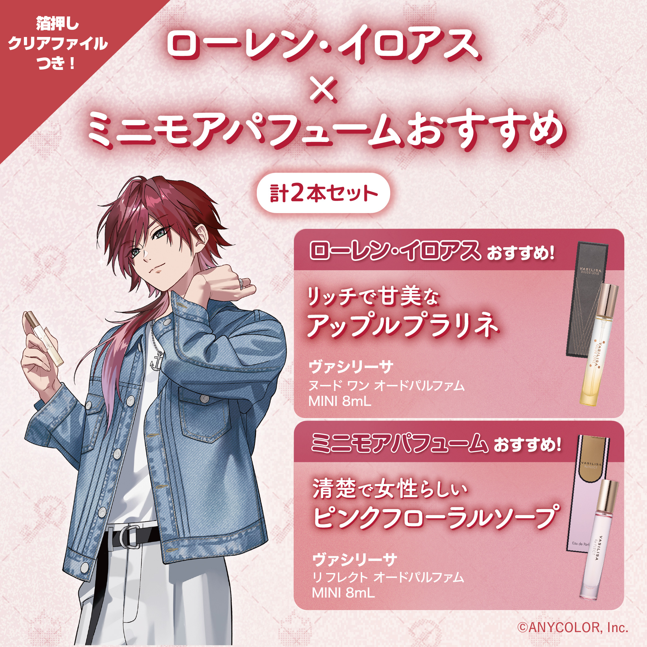 ・ にじさんじコラボ ヴァシリーサ ヌード ワン オードパルファム MINI 8mL リッチで甘美なアップルプラリネの香り ・にじさんじコラボ ヴァシリーサ リ フレクト オードパルファム MINI 8mL 清楚で女性らしいピンクフローラルソープの香り ・にじさんじオリジナルクリアファイル 撮りおろしイラストを使用した豪華箔押しクリアファイル